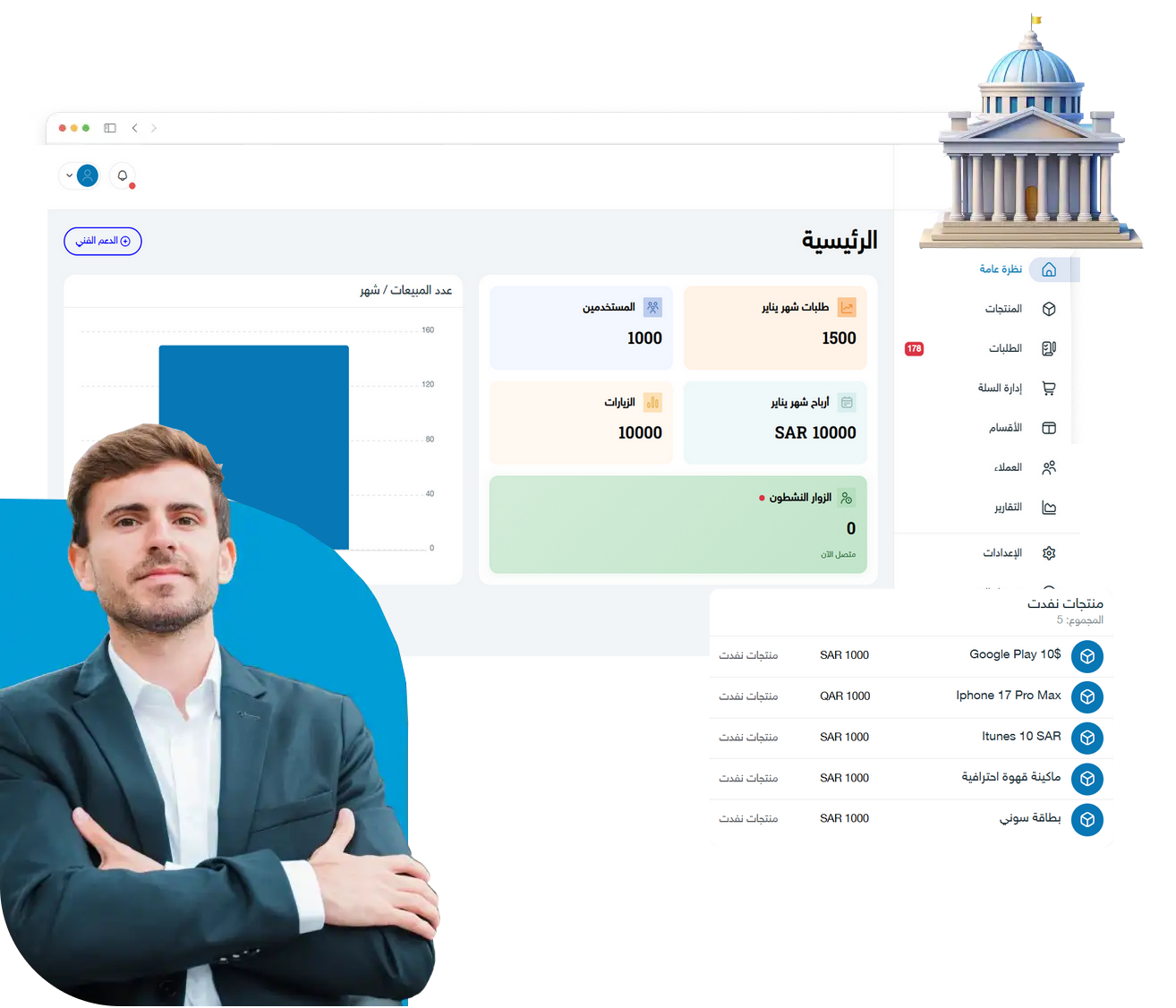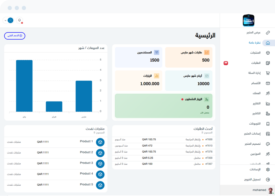 تحكم كامل في متجرك من مكان واحد. أضف المنتجات، تابع الطلبات، أدر المخزون، وراقب أرباحك بتقارير تفصيلية لحظية دون الحاجة للتنقل بين أنظمة متعددة.